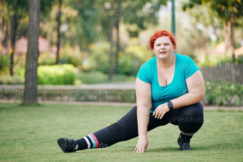 Женщина с избыточным весом растягивает ноги