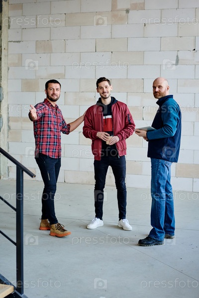 Три молодых успешных инженера или строителя, стоящих внутри незавершенного здания