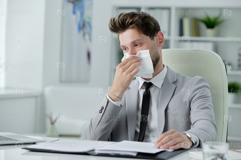 Бизнесмен с слизистым носом на рабочем месте