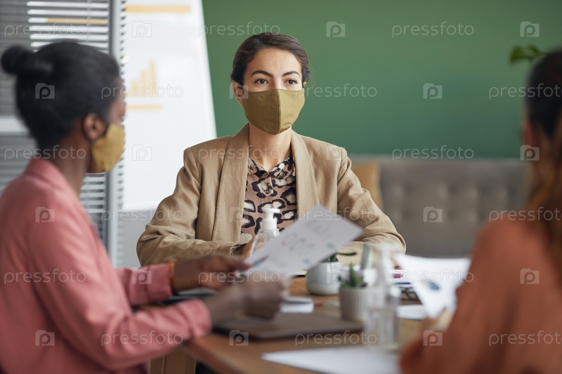 Деловые женщины, носящие маски на встрече