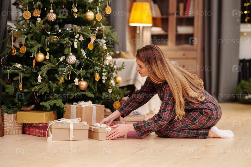 Блондинка-молодая женщина в пижаме кладет рождественские подарки под украшенную фиртри
