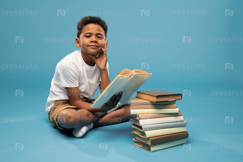 Печальный африканский мальчик начального возраста, сидящий на полу с высокой стопкой книг