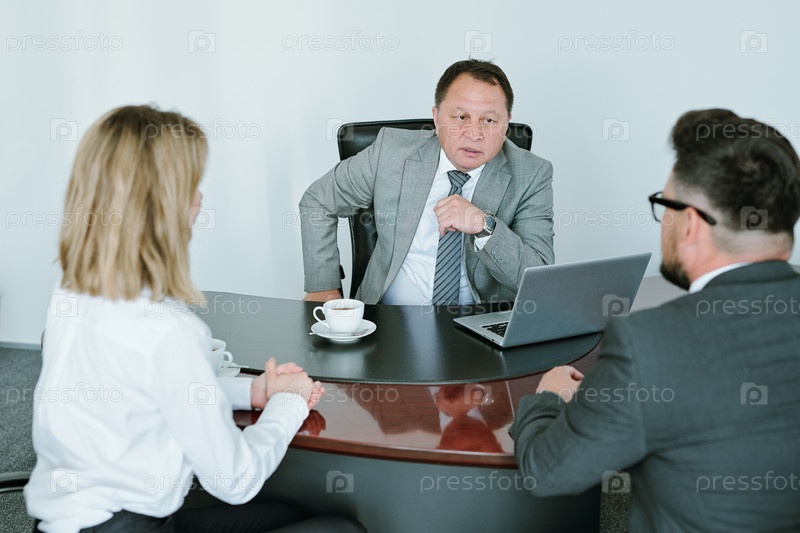 Уверенный зрелый босс в формальной одежде консультирует подчиненных о своих обязанностях