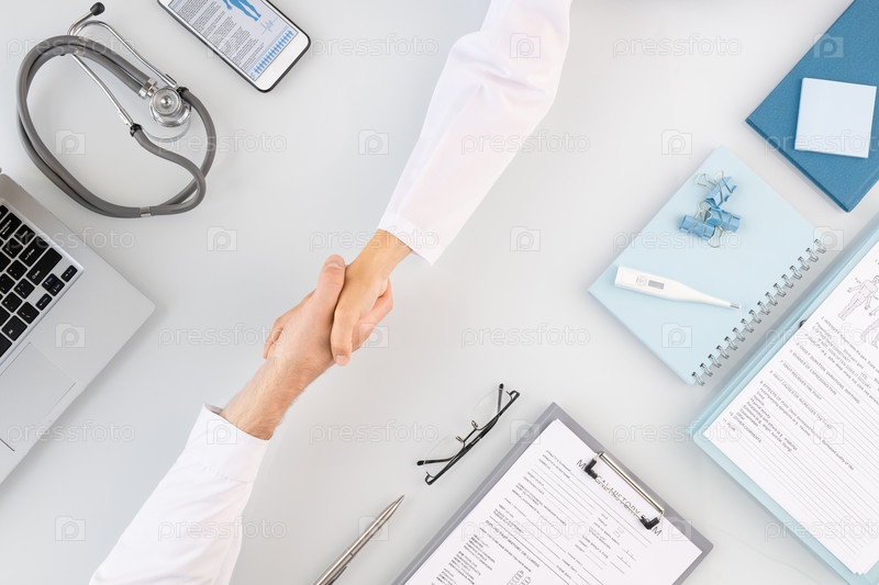Пожимание рук двух молодых успешных клиницистов в белых халатах, приветствующих друг друга