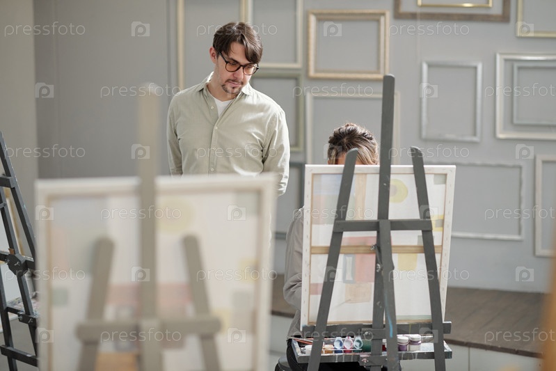 Серьезный учитель профессионального курса живописи стоит рядом с одним из своих учеников