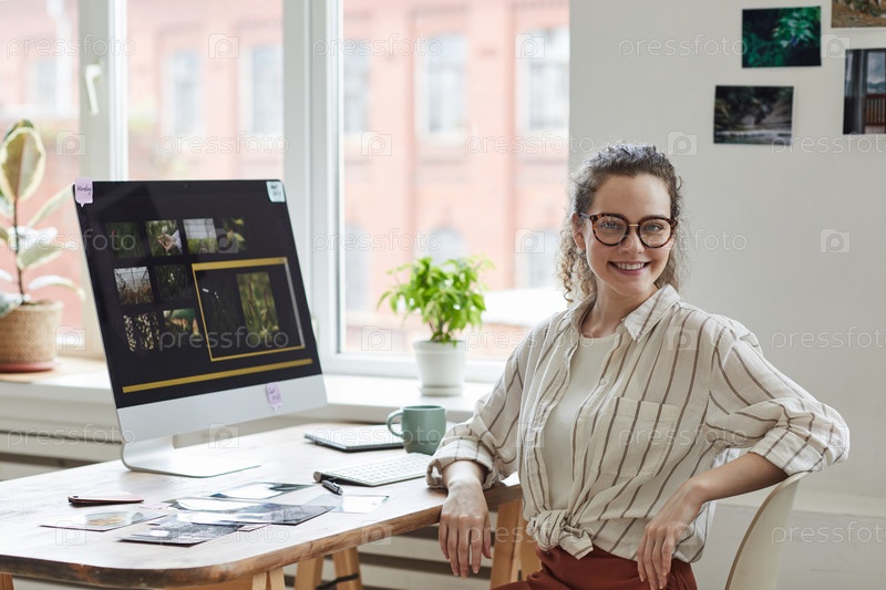 Улыбающаяся женщина-фотограф позирует за рабочим столом