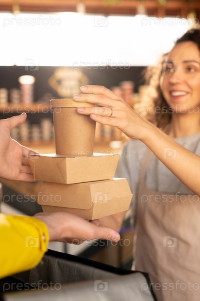 Рука молодой официантки в фартуке, держащей два картонных контейнера с едой