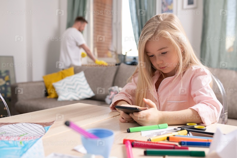 Милая девочка прокручивает фотографии на смартфоне, сидя за столом