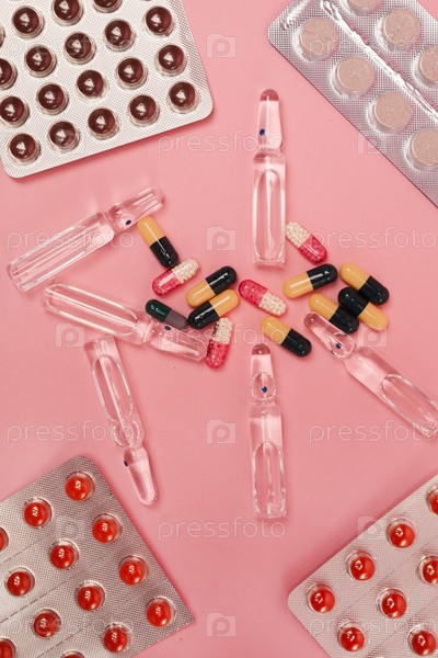 Различные лекарства на розовом фоне