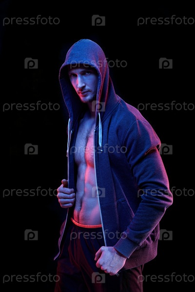 Молодой мускулистый спортсмен-мужчина в расстегнутой толстовке с капюшоном стоит перед камерой