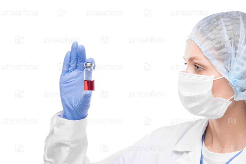 Красивая молодая медсестра или фармацевт, держащая маленькую бутылочку с красной жидкой вакциной