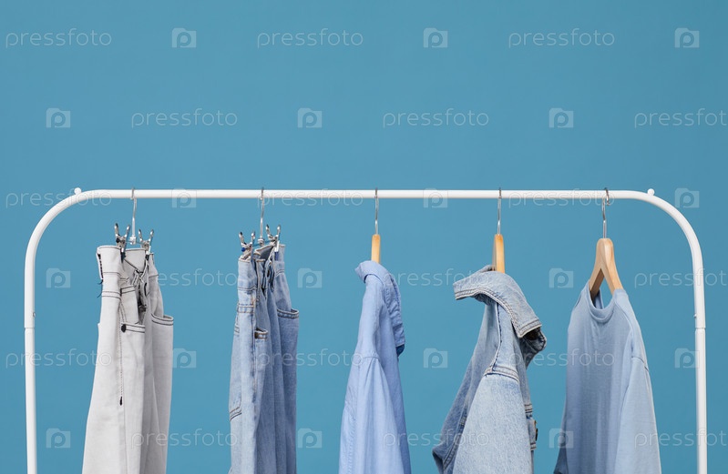Джинсы, одежда на стойке
