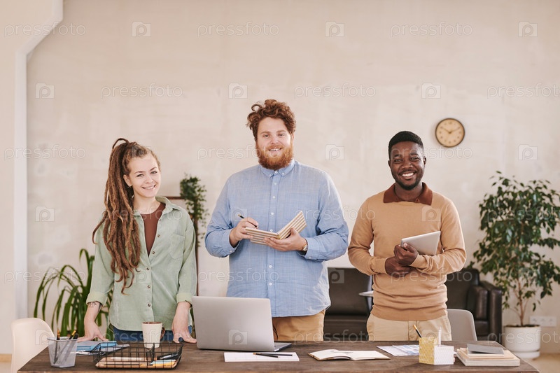 Группа веселых молодых сотрудников из нескольких этнических групп в непринужденных нарядах, стоящих за столом с блокнотами и ноутбуком в офисе и смотрящими на камеру