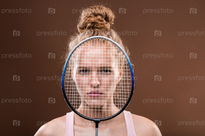 Серьезная спортсменка с светлыми волосами смотрит на тебя из-за теннисной ракеты