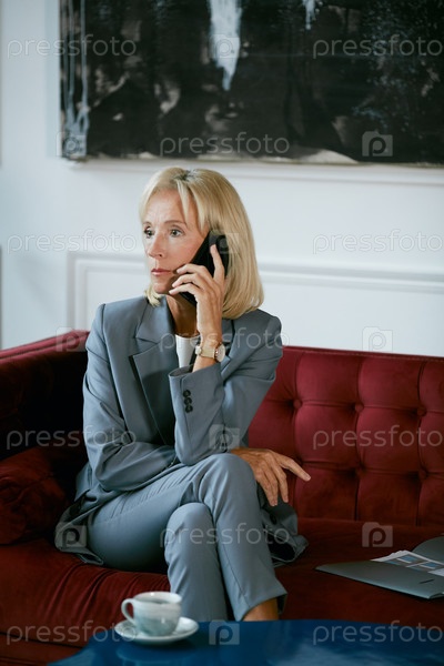 Зрелая бизнесвумен разговаривает по телефону в кафе