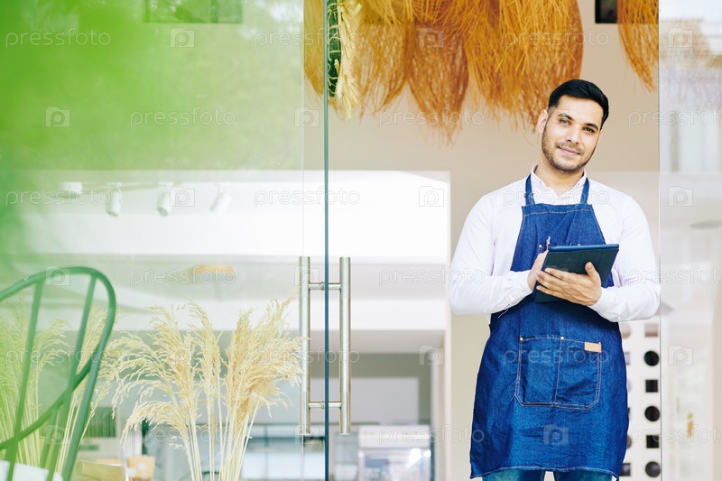 Владелец пекарни стоит у входа