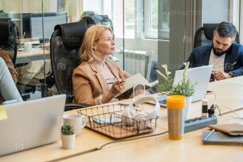 Зрелая задумчивая блондинка-бизнесwoman с открытым блокнотом, сидящая в кресле