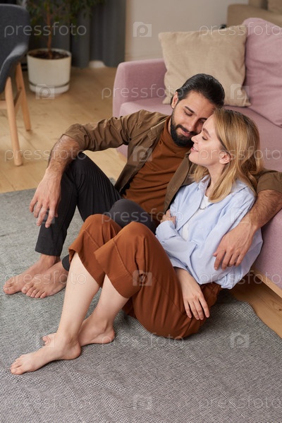 Высокоугольный снимок молодого человека и влюбленной женщины, которые проводят время вместе дома, сидя на полу в гостиной, опираясь друг на друга