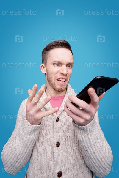 Раздраженный молодой человек с яростным выражением лица смотрит на экран смартфона