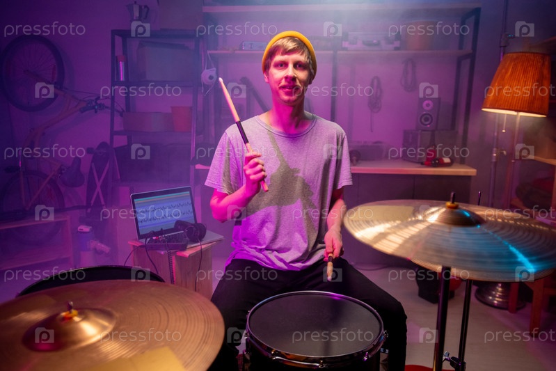 Парень в футболке, джинсах и шапке смотрит на тебя, играя на барабанах и кимбалах