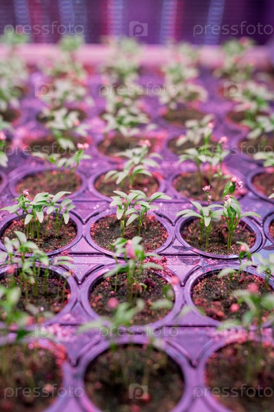 Перспективный фон многих рядов зеленых саженцев, растущих в небольших горшках
