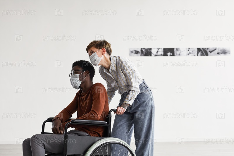 Инвалидный молодой человек посещает музей современного искусства