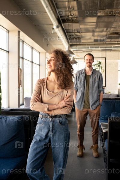 Счастливая молодая женщина в бежевом пуловере и синих джинсах, скрестившая руки за грудь