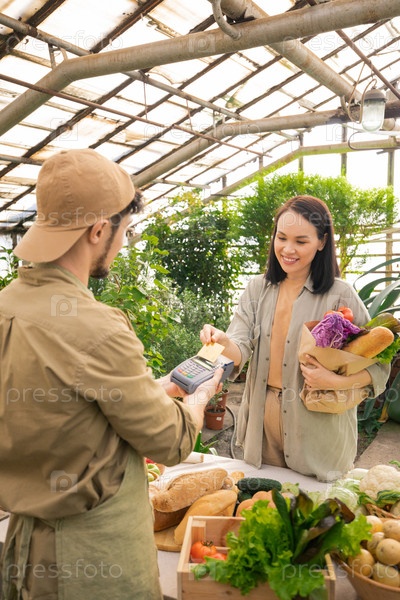 Азиатская женщина делает бесконтактные платежи в продуктовом магазине