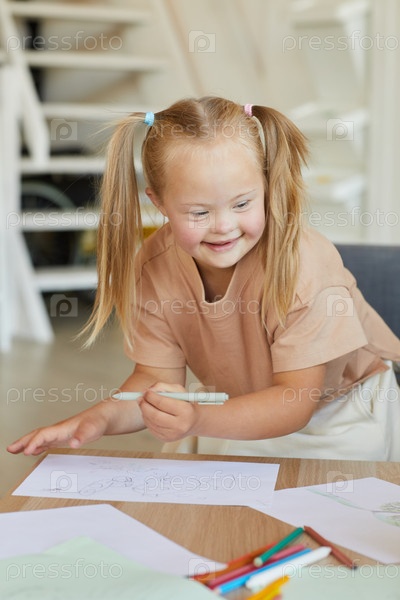 Веселая девочка с синдромом Дауна наслаждается рисованием