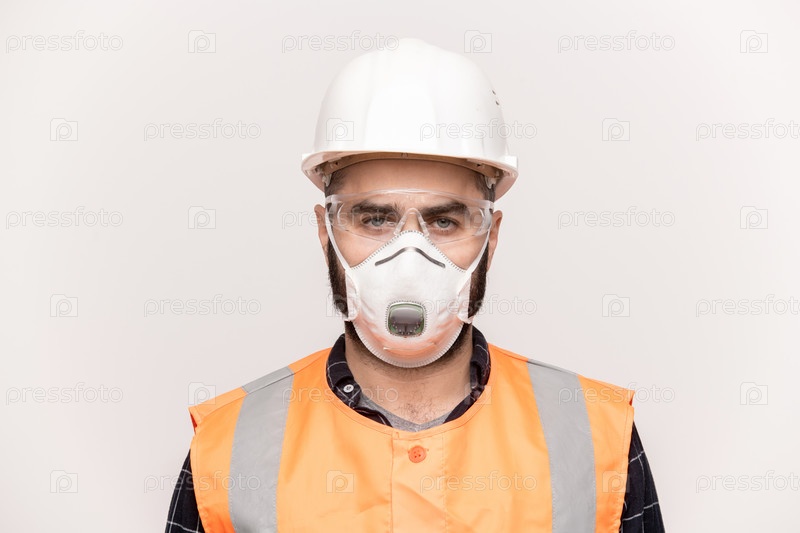Серьезный мужской техник в оранжевой рабочей одежде, защитных очках и маске