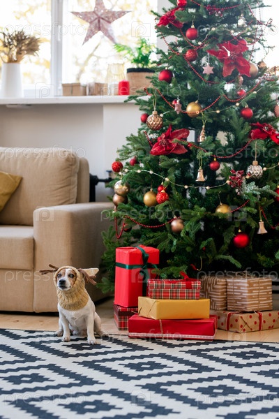 Милая и смешная собака в теплом вязанном головном уборе, сидящая возле рождественской елки