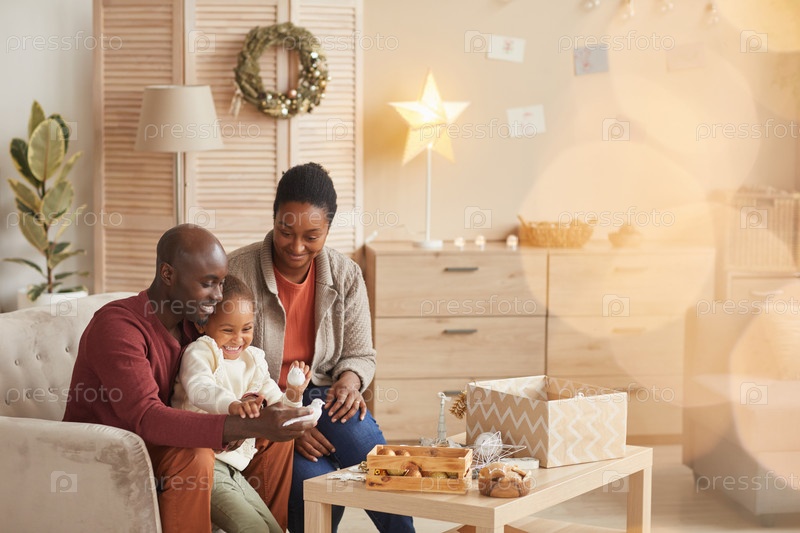 Счастливая афроамериканская семья украшает дом на Рождество