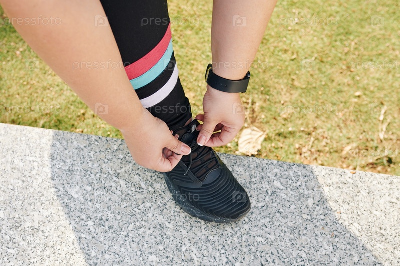 Женщина, завязывающая шнурки обуви