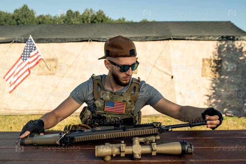 Бородатый мужчина осматривает свою винтовку