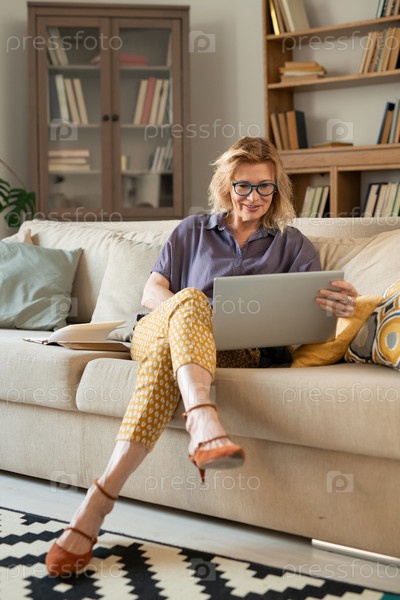 Зрелая блондинка-бизнесwoman смотрит на дисплей планшета, сидя на диване