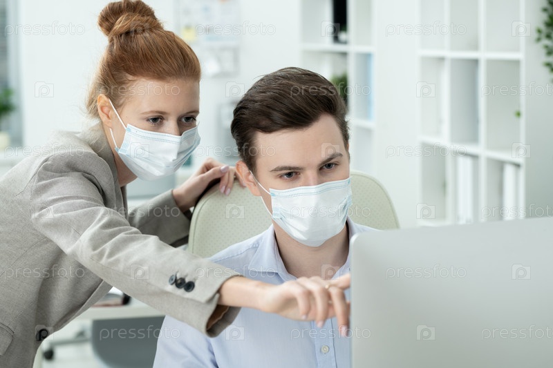 Молодая менеджерка в костюме и защитной маске, указывающая на компьютерный экран