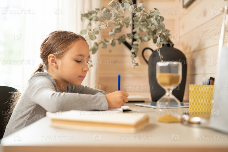 Тщательная школьница в сером пуловере сидит за столом и держит ручку над страницей
