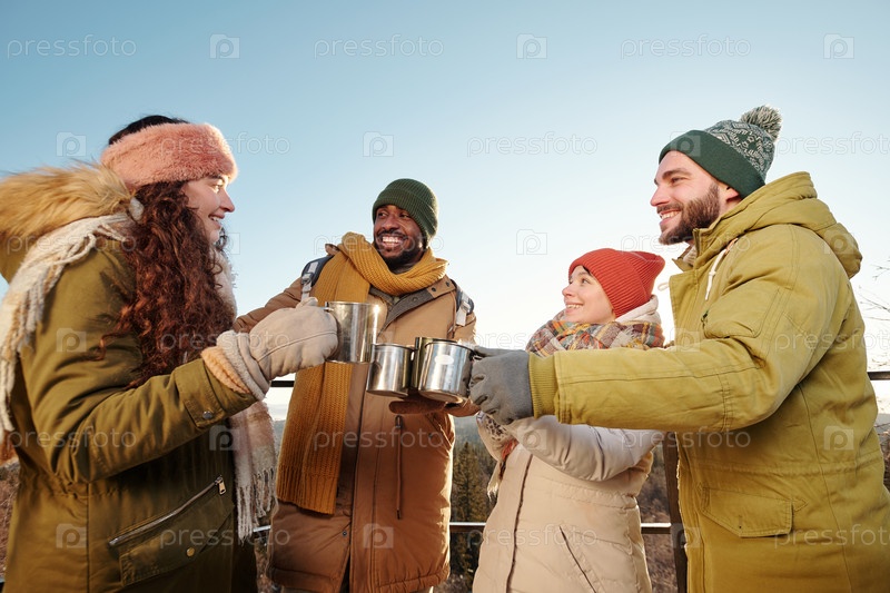 Счастливые молодые друзья в зимней одежде, радуются горячему чаю и болтают
