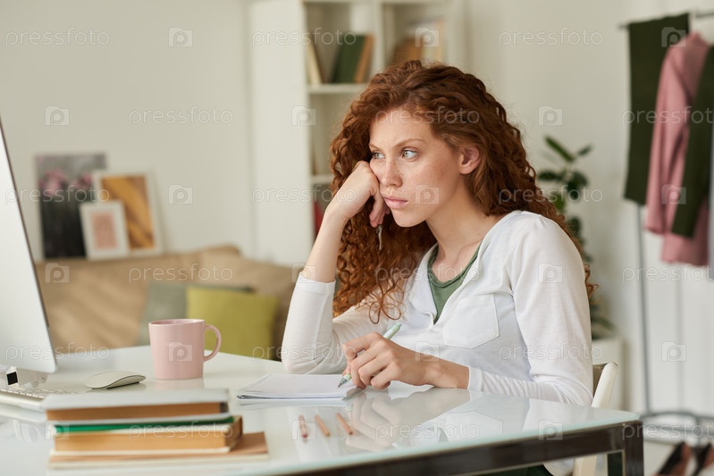 Запутавшаяся, отвлеченная рыжеволосая девушка сидит за столом и оглядывается в сторону во время выполнения университетского задания дома