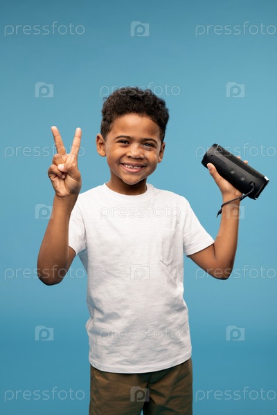 Веселый маленький мальчик африканской национальности показывает мирный жест, развлекаясь