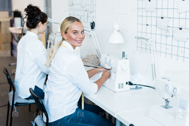 Молодая веселая швейщица в джинсах и белой рубашке смотрит на тебя во время работы