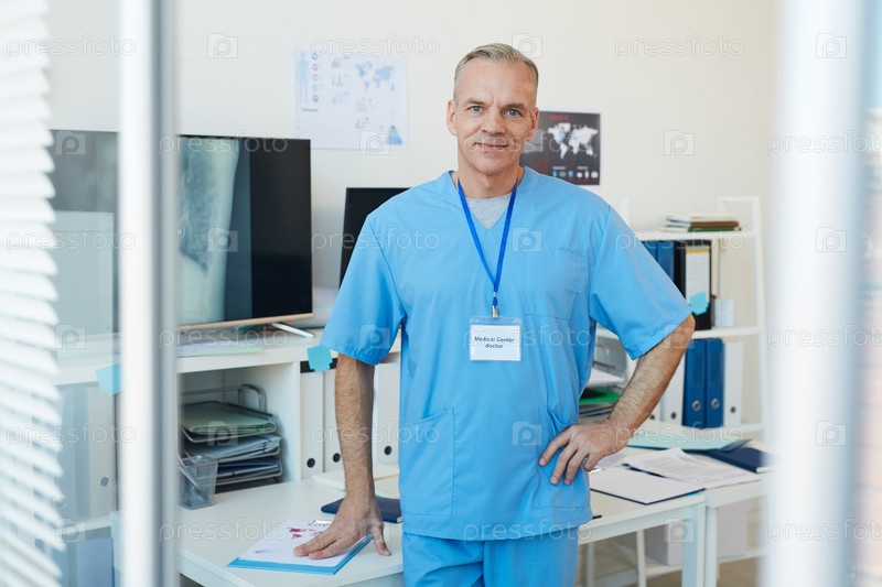 Улыбающийся зрелый доктор позирует на рабочем месте в клинике