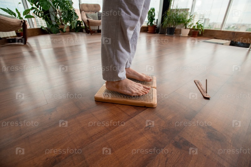 Молодой босоногий мужчина в спортивных брюках практикует йогу упражнения с фимиачной палкой