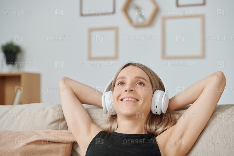 Молодая блондинка веселая женщина в наушниках держит руки за головой