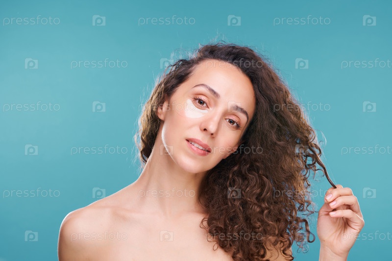 Молодая красивая женщина с нижними пятнами, касающимися темных длинных волнистых волос