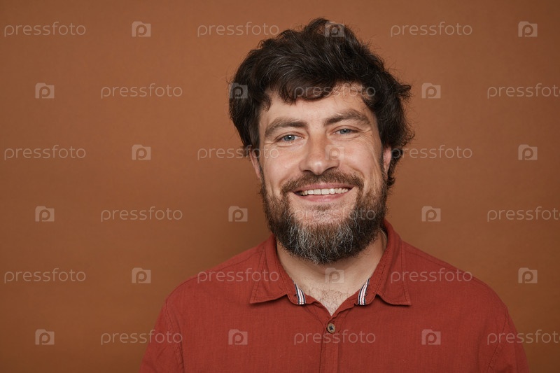 Беспечный бородатый мужчина улыбается перед камерой