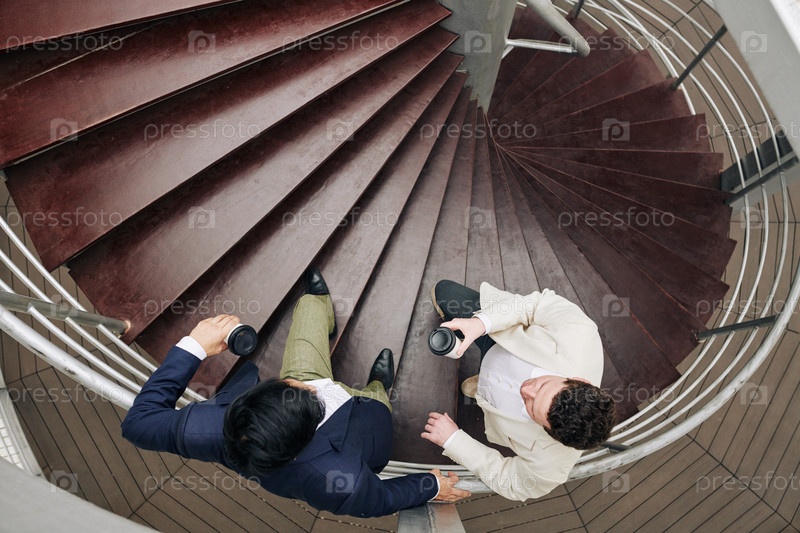 Коллеги по работе разговаривают на спиральной лестнице
