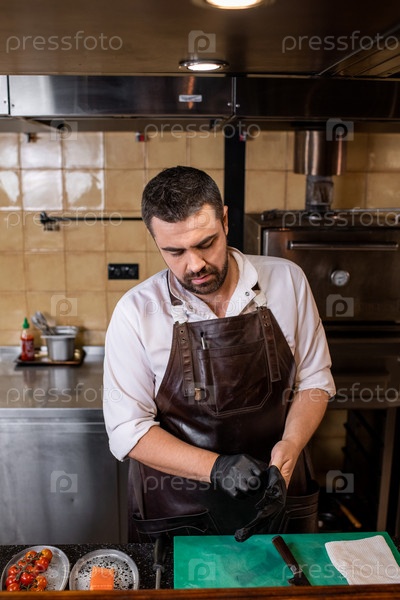 Шеф надевает перчатки на руки