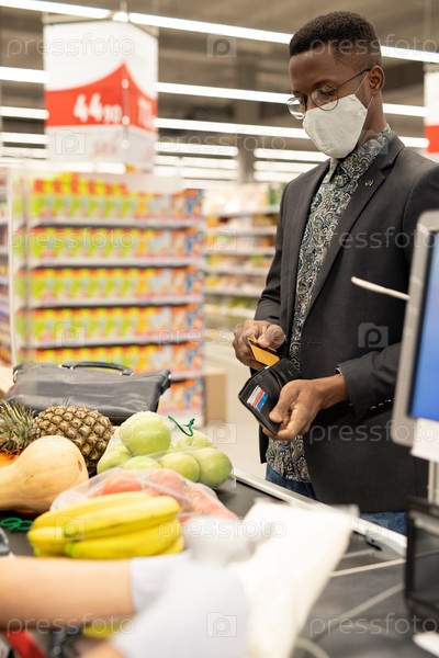Руки зрелой покупательницы-женщины со смартфоном над платежным автоматом