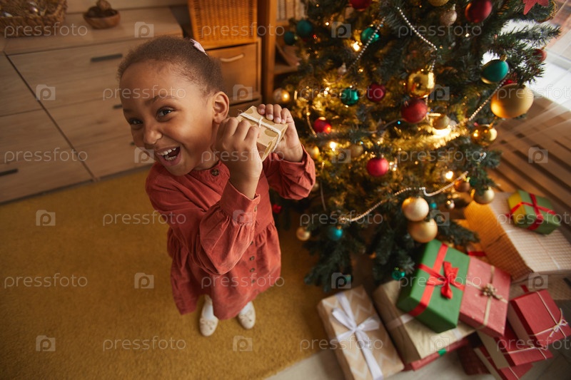 Взволнованная девушка держит рождественский подарок